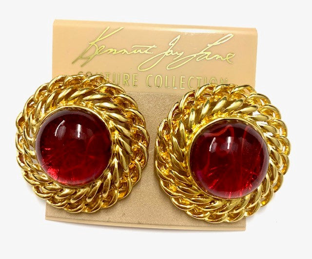 Large Gold Braided Edge- Flaw Ruby Center Clip Earring