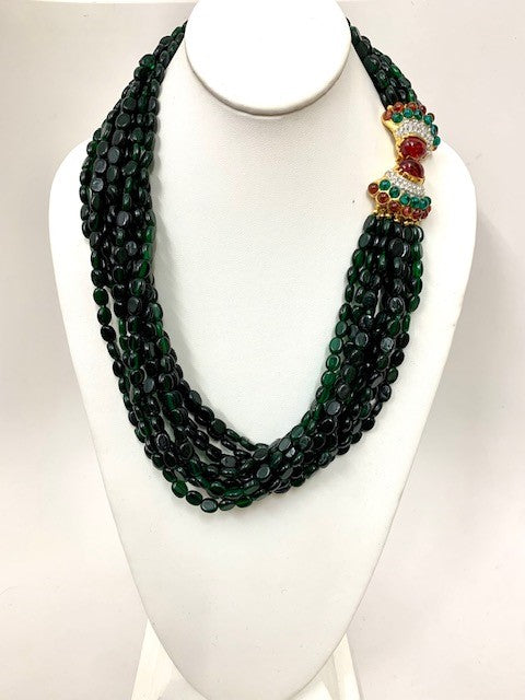 Emerald beaded clasp necklace with gold and two tone rhinestones, with flawed ruby & emerald sides and a flawed ruby center