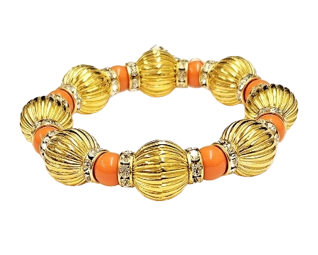 2 1/2" inside diameter with 14mm fluted gold beads/coral & crystal rhondells stretch bracelet
