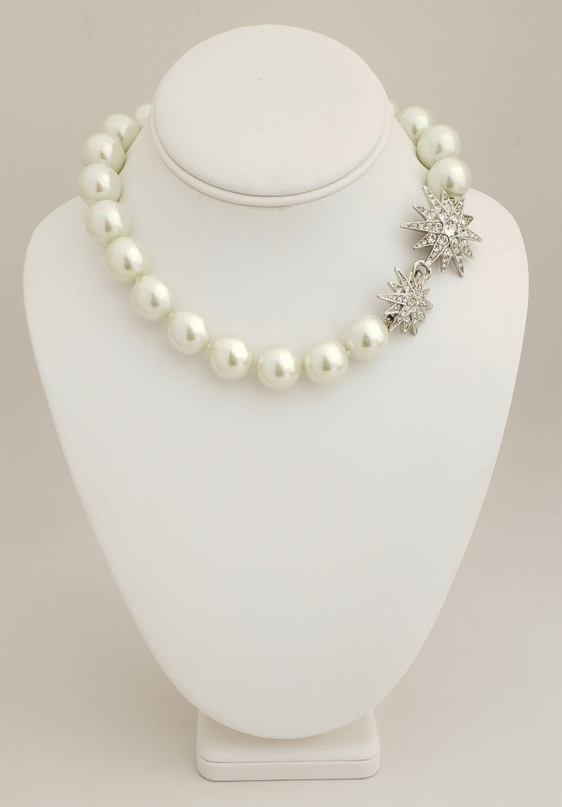 16" White Pearl Rhodium- Rhine Starburst Clasp Necklace