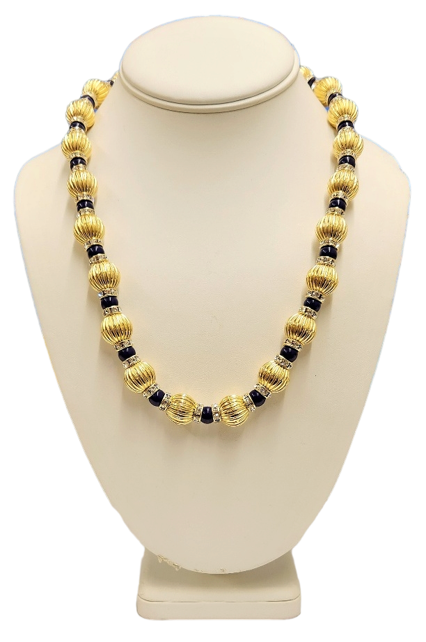 21" 14mm Fluted Gold Beads with Lapis & Crystal Rhondells Lobster Claw Necklace