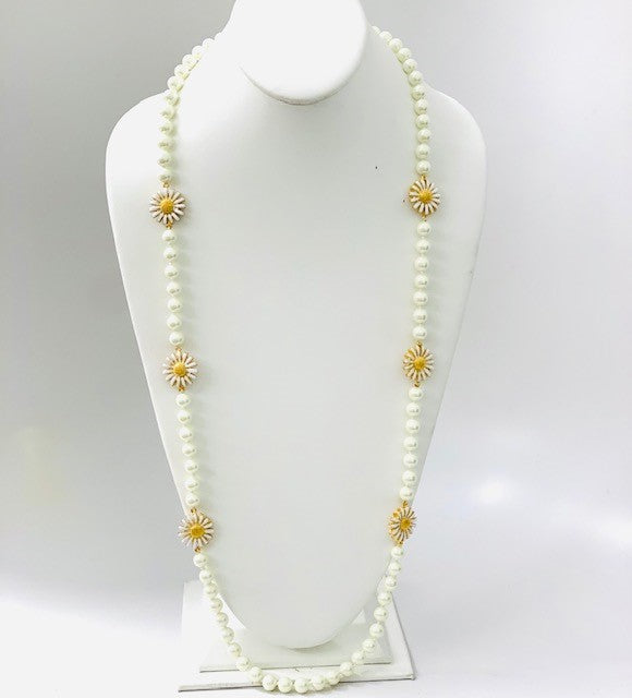 36" 8mm light cultura pearl necklace w/ gold and white enamel daisy motifs and s hook clasp.