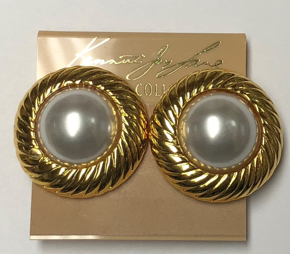 Barbara Bush Gold With Pearl Center Large Button Clip Earring