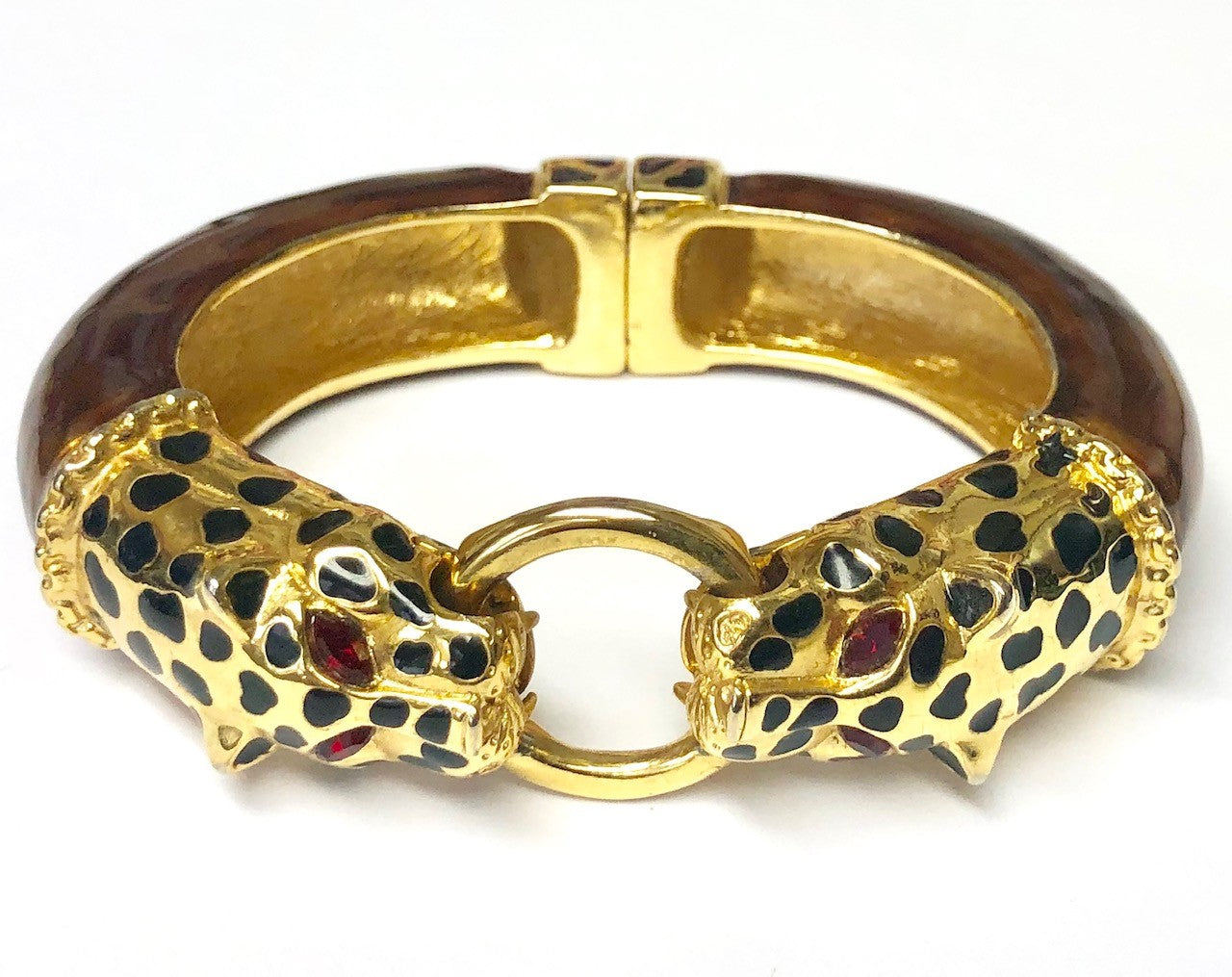 Brown Enamel Gold Black Spots Double Leopard Head Bracelet