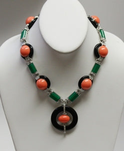 16" Crystal And Jade Bar With Black And Coral Button Necklace
