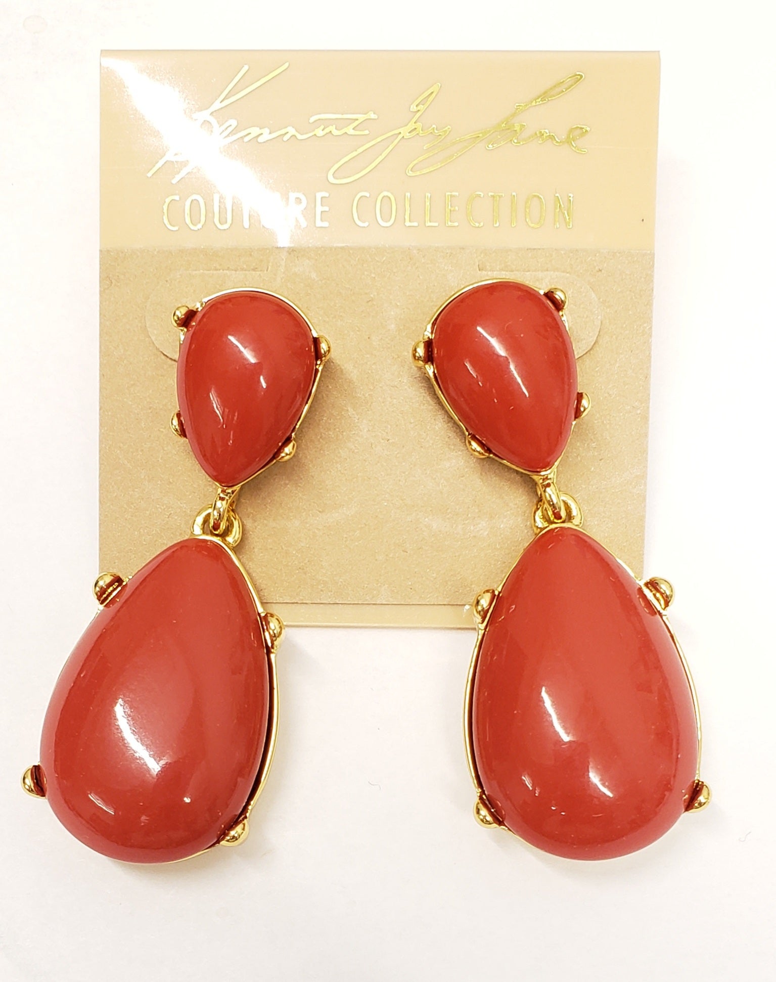 2" gold/dark coral resin teardrop cabochon top & drop pierced earring