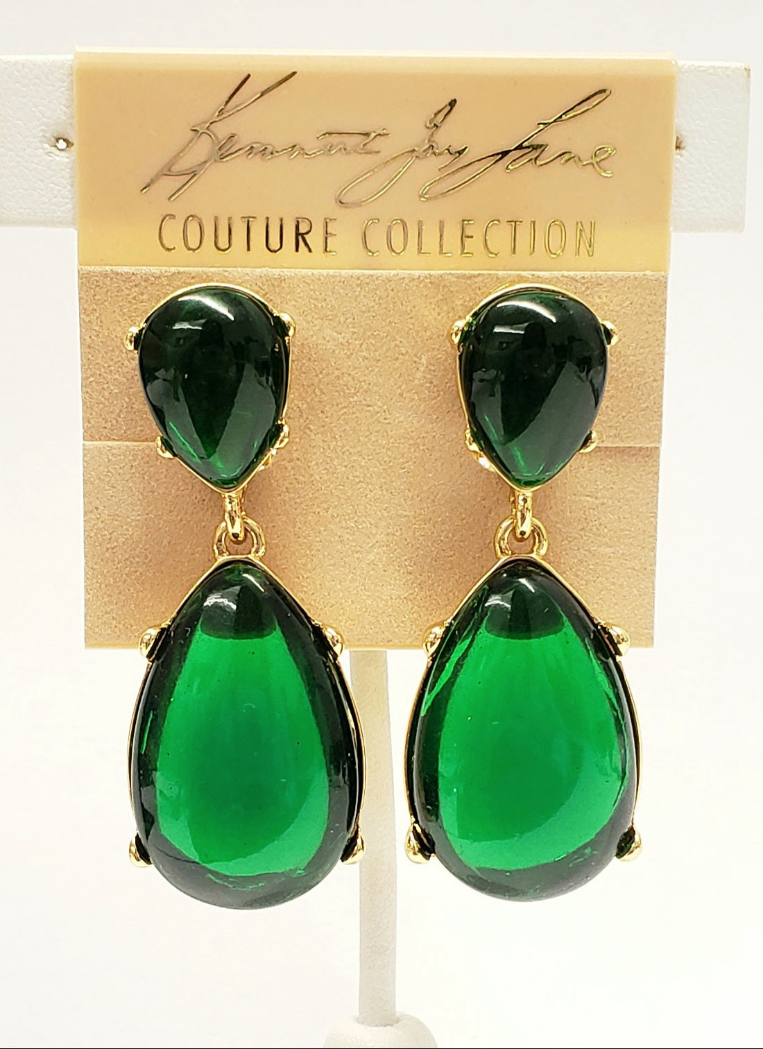 2 "gold/emerald resin teardrop cabochon top & drop pierced earring