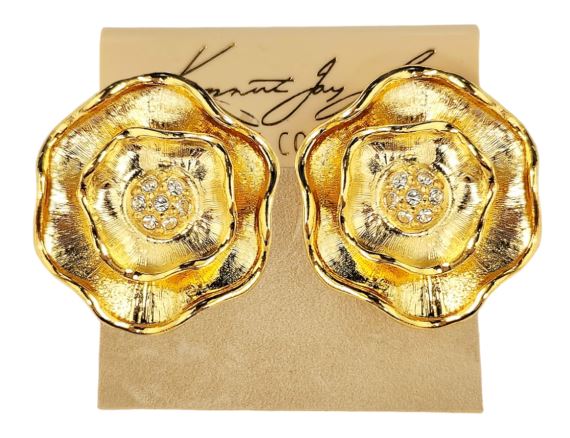 1.25" x 1" gold flower clip on earring with rhinestone center