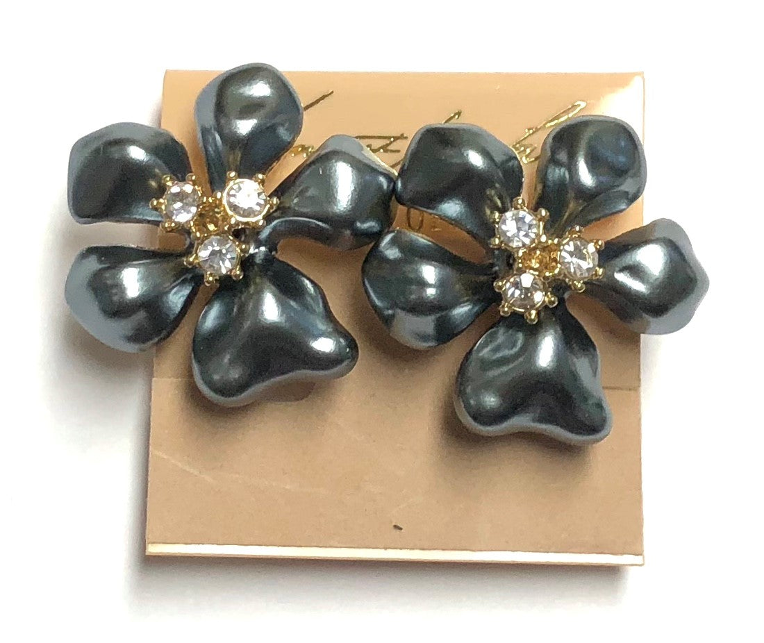 Gold Grey Pearl Crystals Center Flower Clip Earring