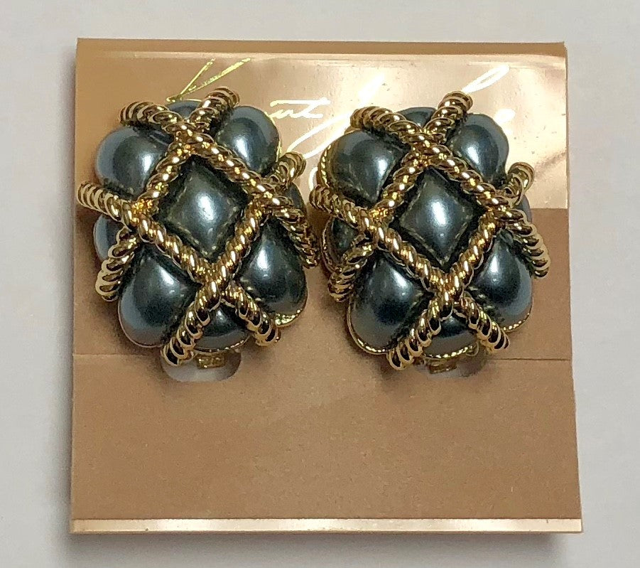 1"x1/2" gold trim grey pearl resin quilted clip earring