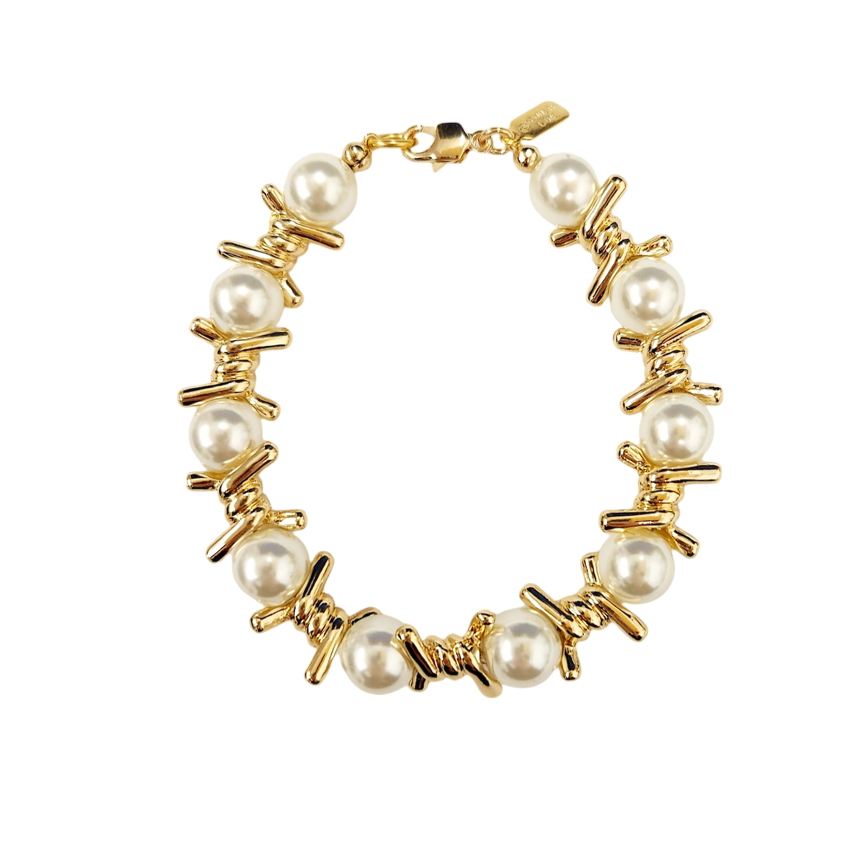 7" gold twist knotted chain bracelet with 10 millimeter white pearls & lobster claw clasp