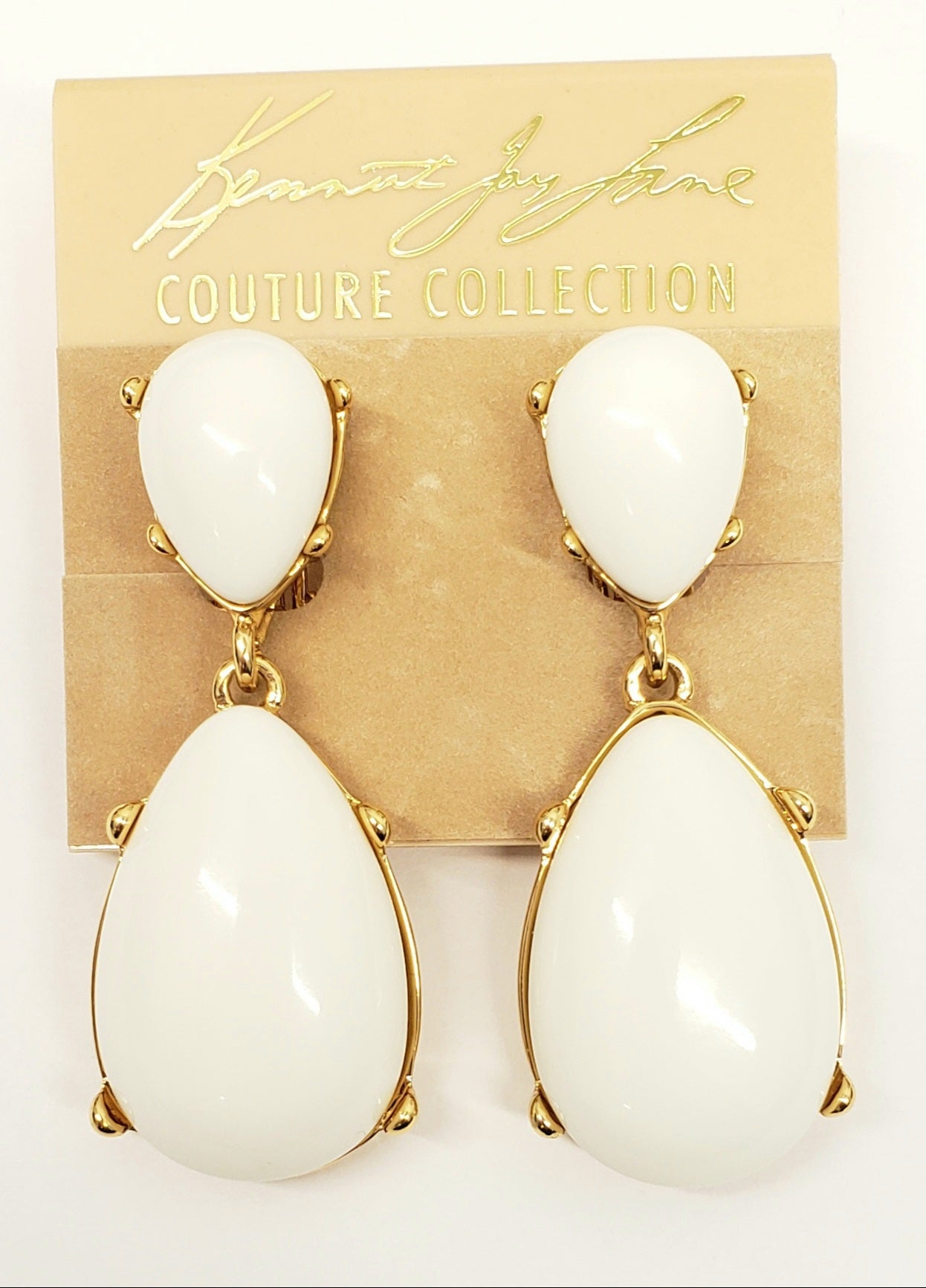 2" gold/white resin teardrop cabochon top & drop clip earring