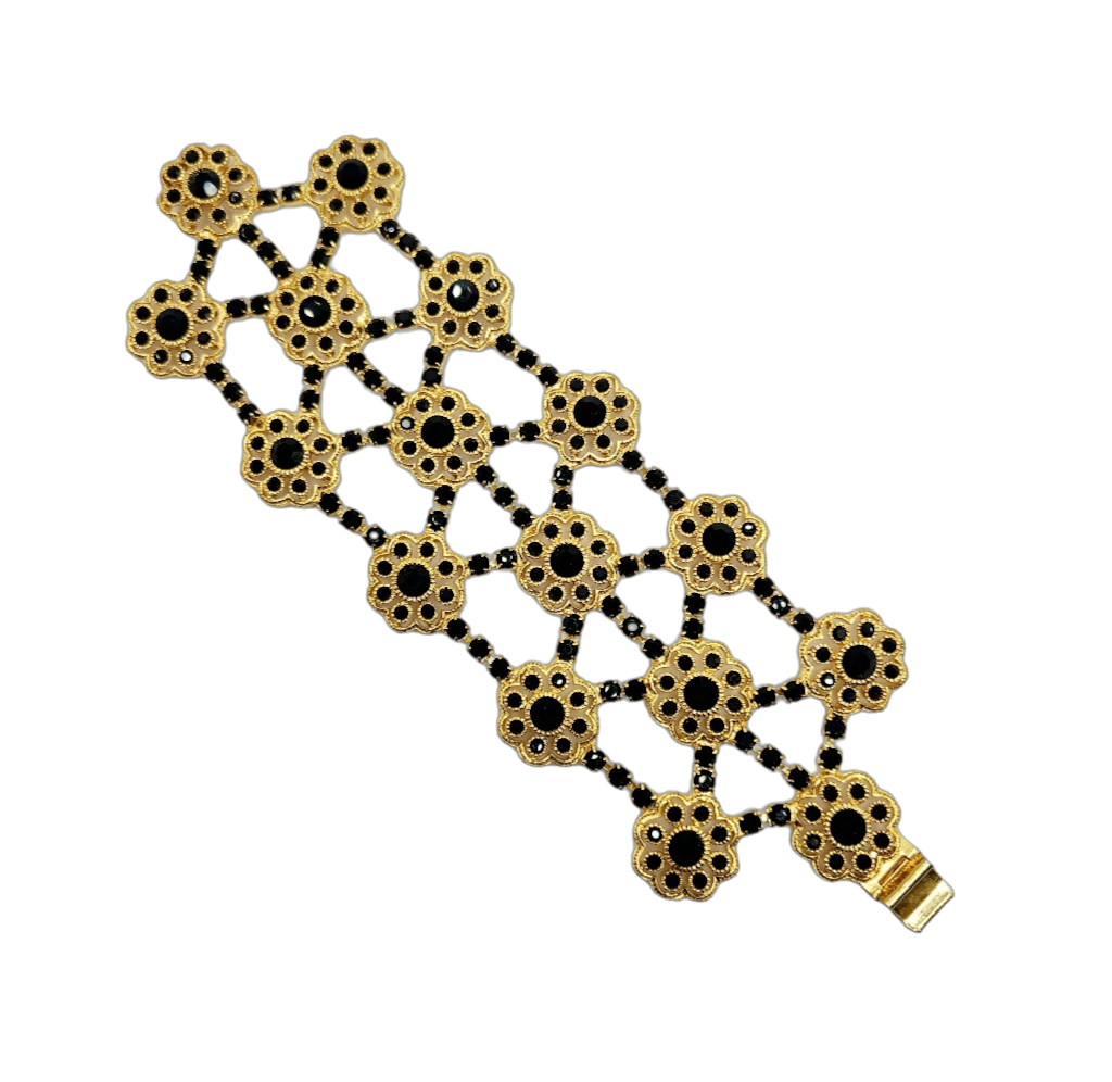 8" gold/jet flower 2.5" wide bracelet with push lock clasp