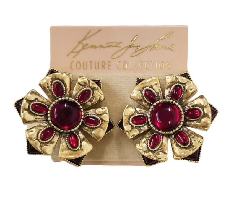 1.25" x 1.25" light antique gold post earring with ruby cabochon centers
