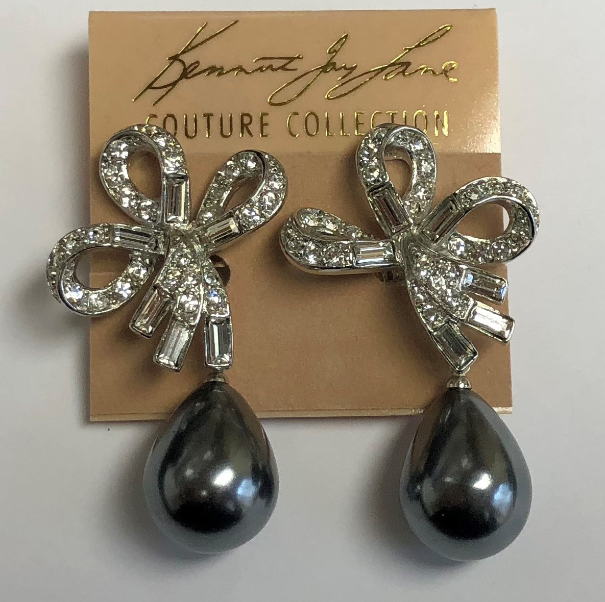 Rhodium-plated with crystals bow top and grey pearl teardrop clip earring