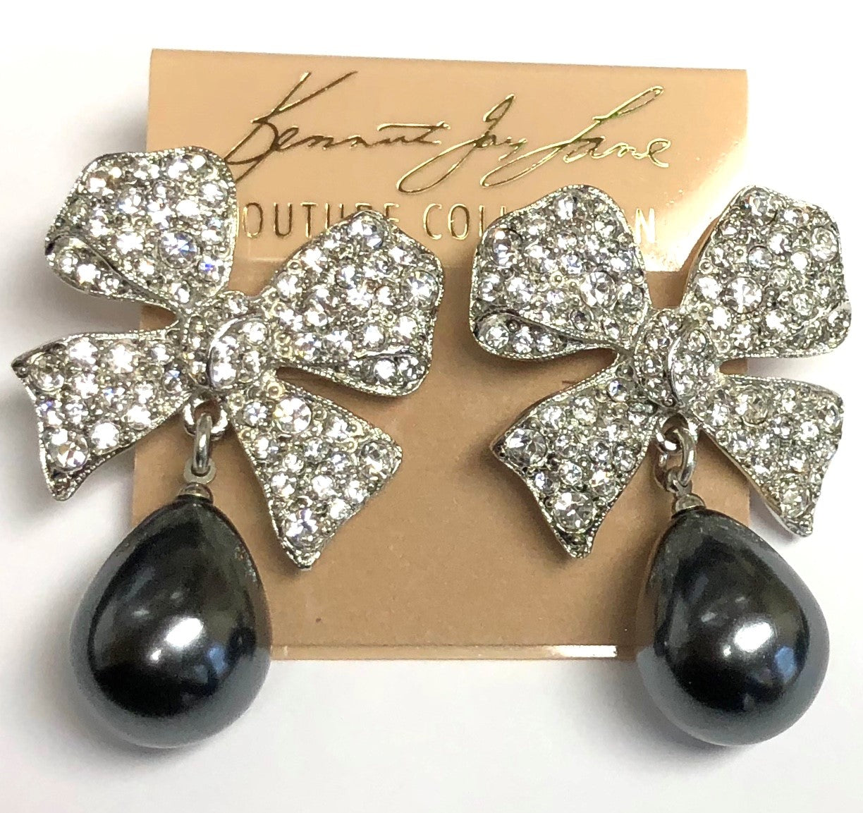 Rhodium-plated with crystals and dark grey pearl drop bow pierced earring
