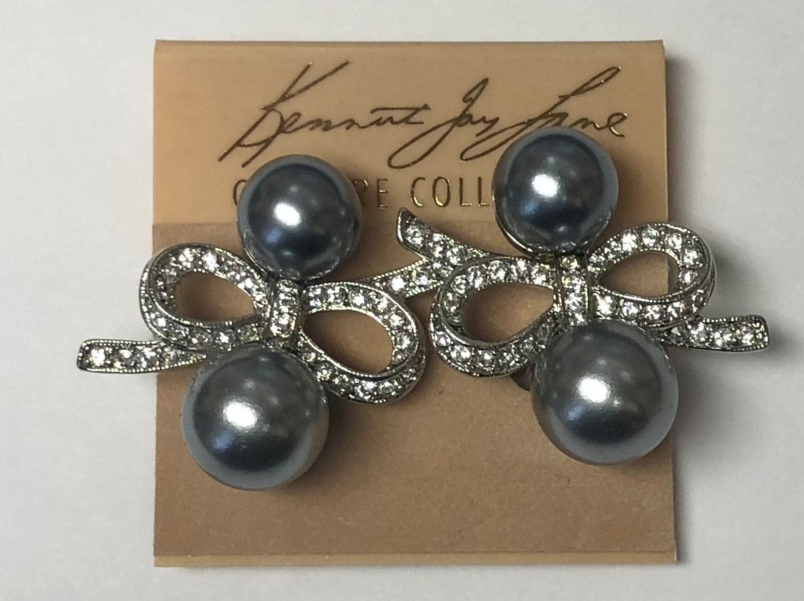 Rhodium-plated with crystals and gray double pearls bow clip earring