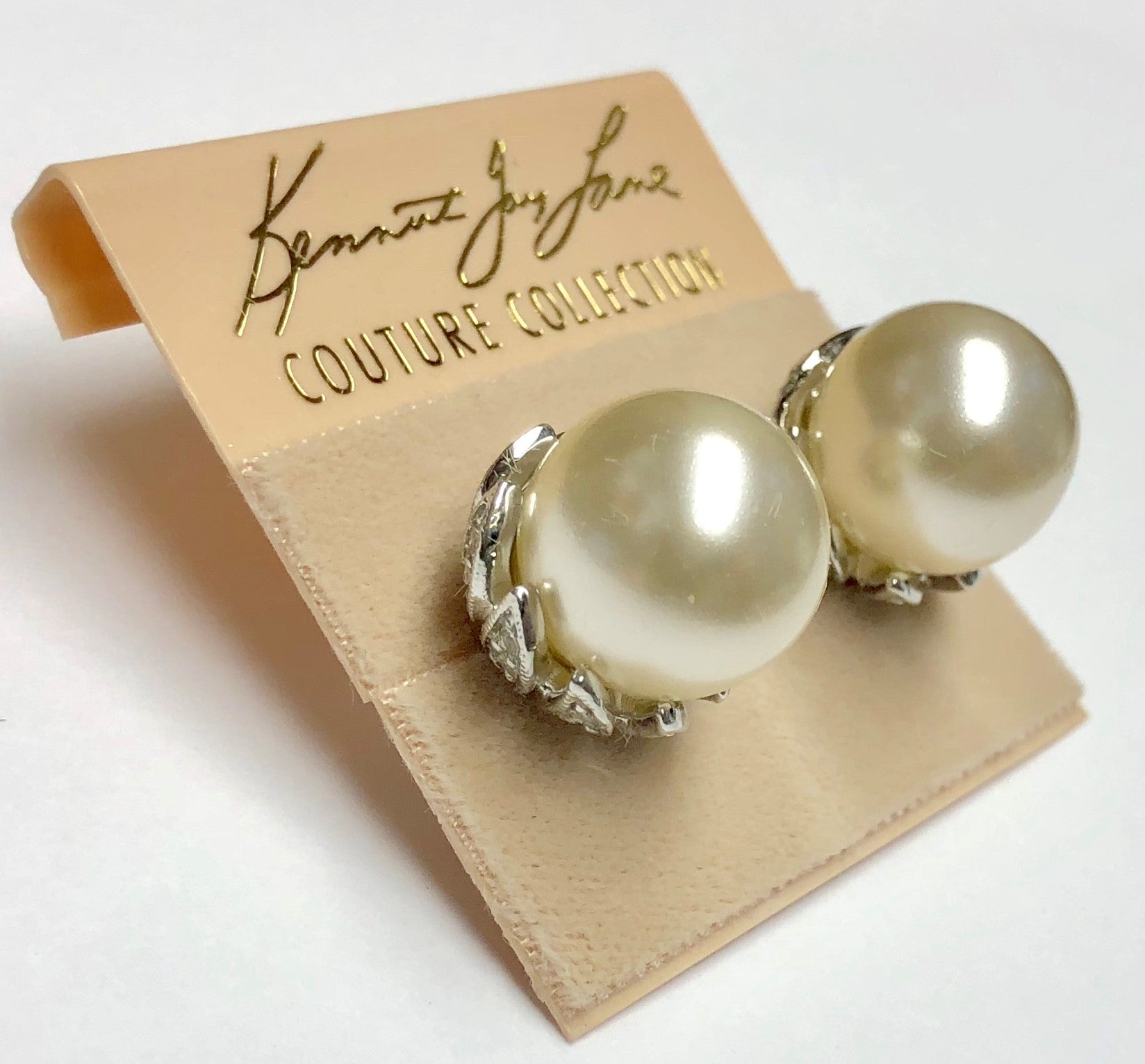 Rhodium-plated with crystals and white pearl center flower bud clip earring