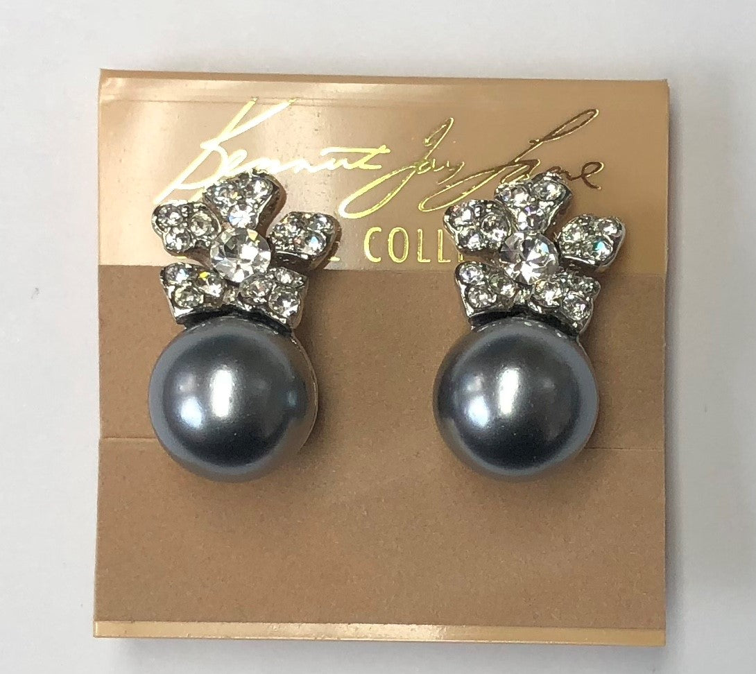 Rhodium Crystals Flower Top And Grey Pearl Bottom Clip Earring