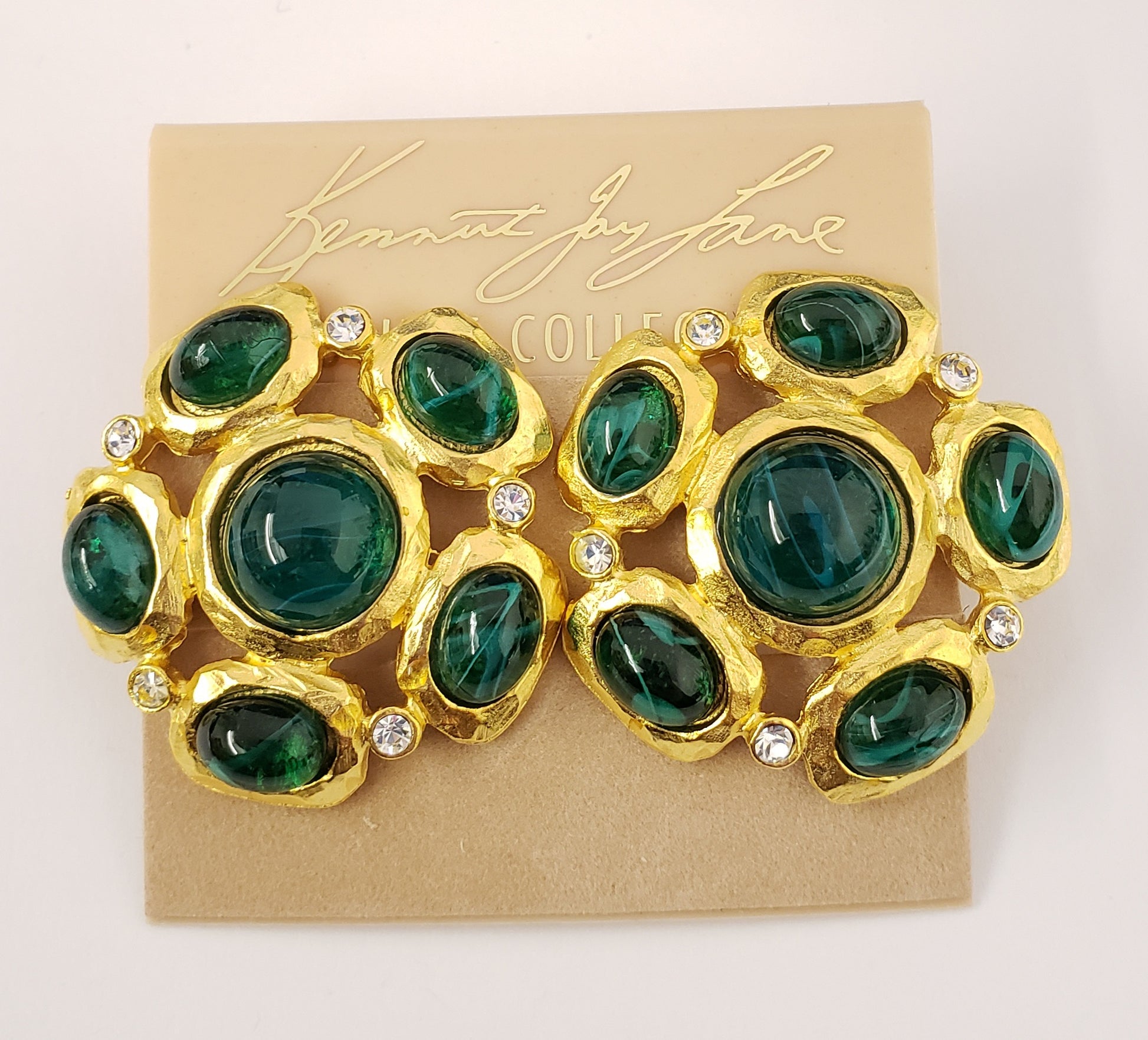 1 1/4" x 1/ 1/4" satin gold/crystal flawed emerald cabochons cluster pierced ear
