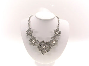 Silver Crystal Pearl Center Flower Chain Link Necklace