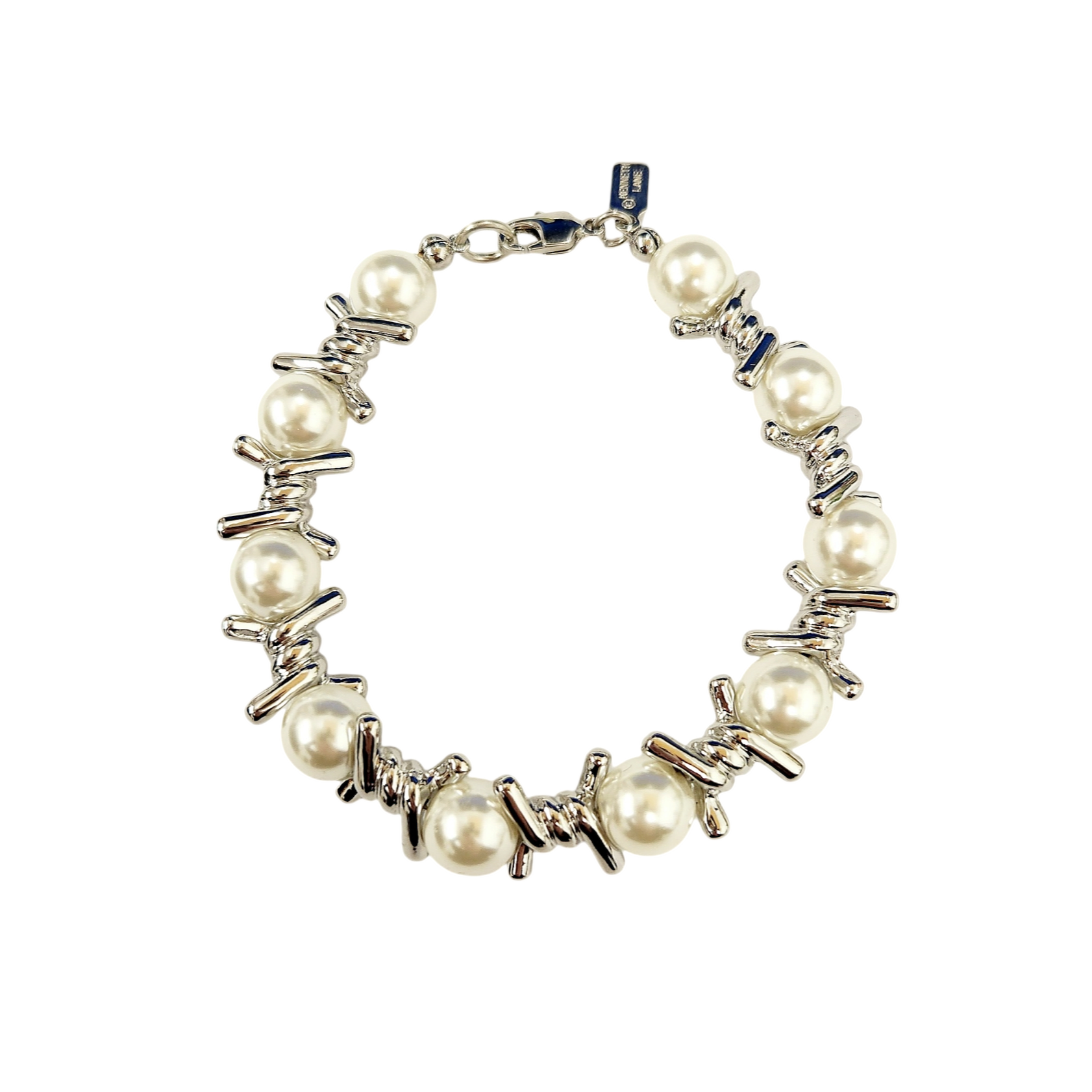 7" silver twist knotted chain bracelet with 10 millimeter white pearls & lobster claw clasp