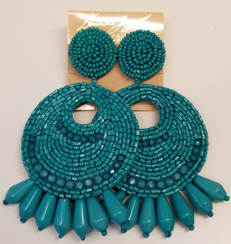 Turquoise Seed Bead Round Gypsy Hoop With Drops Clip Earrings