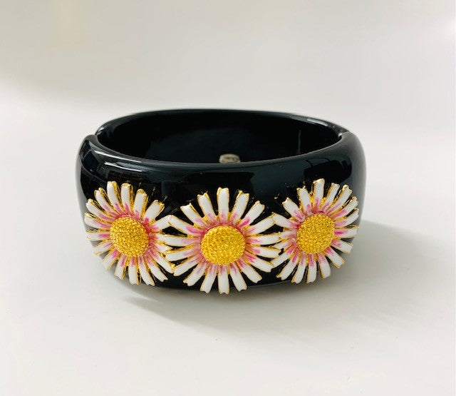 2.5" wide black resin cuff bracelet w/ 3 gold/white and pink enamel daisy motifs and magnetic clasp.