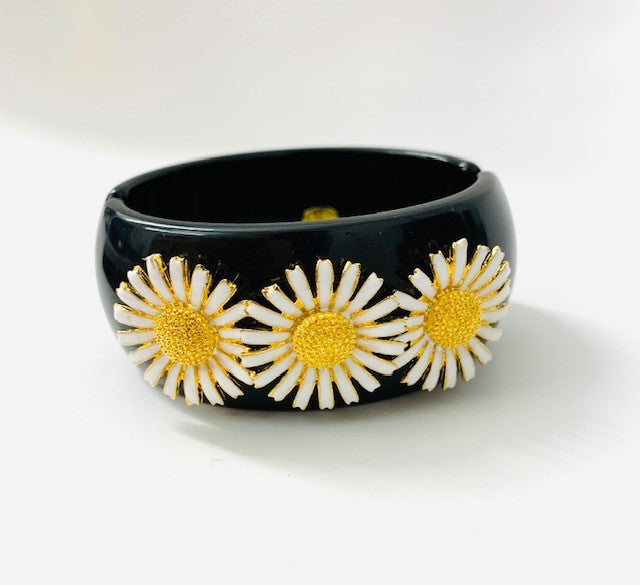 2.5" wide black resin cuff bracelet w/ 3 gold/white enamel daisy motifs and magnetic clasp.